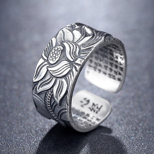 Lotus Flower Adjustable Silver Ring Engraved with Heart Sutra